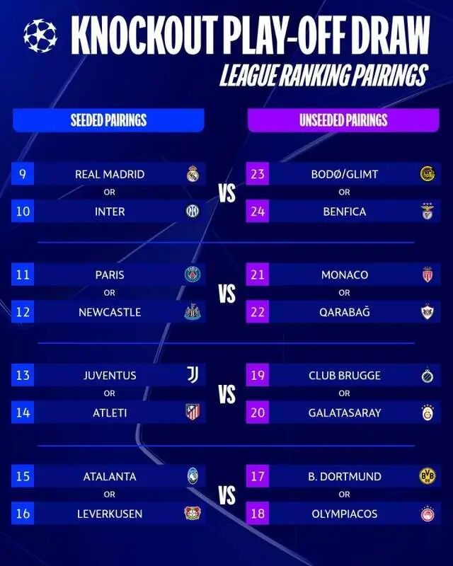 也就是說按著比賽成績來分,目前只存在四組比賽對陣,分別是摩納哥、卡拉巴赫對巴黎圣日耳曼、紐卡斯?fàn)?,布魯日、加拉塔薩雷對尤文圖斯、馬德里競技,博德閃耀、本菲卡對皇馬、國米,多特蒙德、奧林匹亞科斯對亞特蘭大、勒沃庫森。